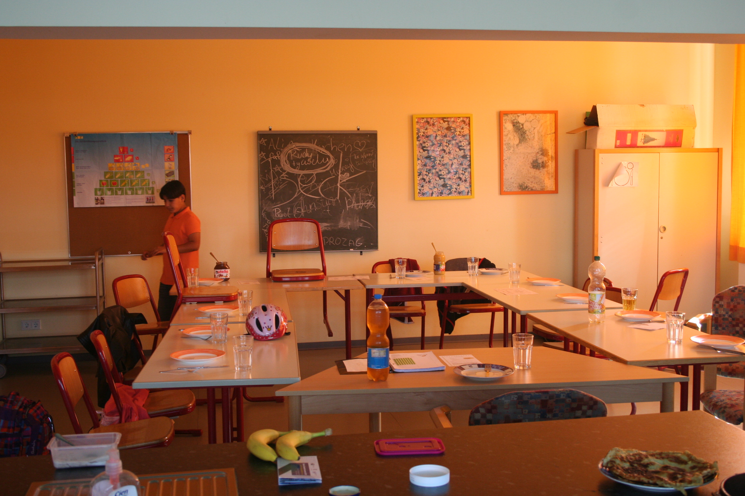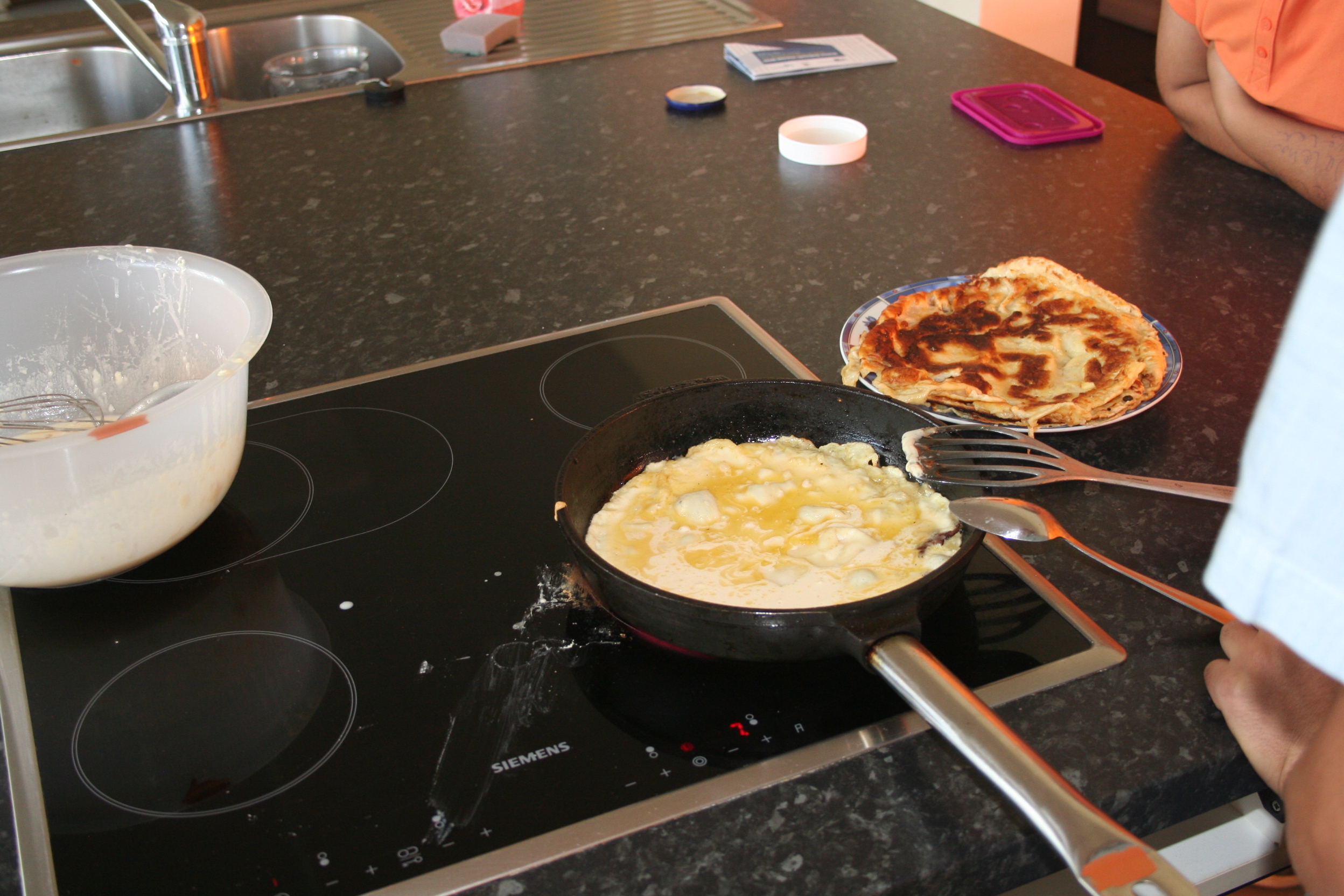 Einblick: An diesem schönen Montag im September (2016) gab es köstliche Pfannkuchen. Die Schwierigkeit dabei war, den platten Kuchen, mit dem Pfannenwender, auf die andere Seite zu drehen, damit beide Seiten köstlich braun werden.